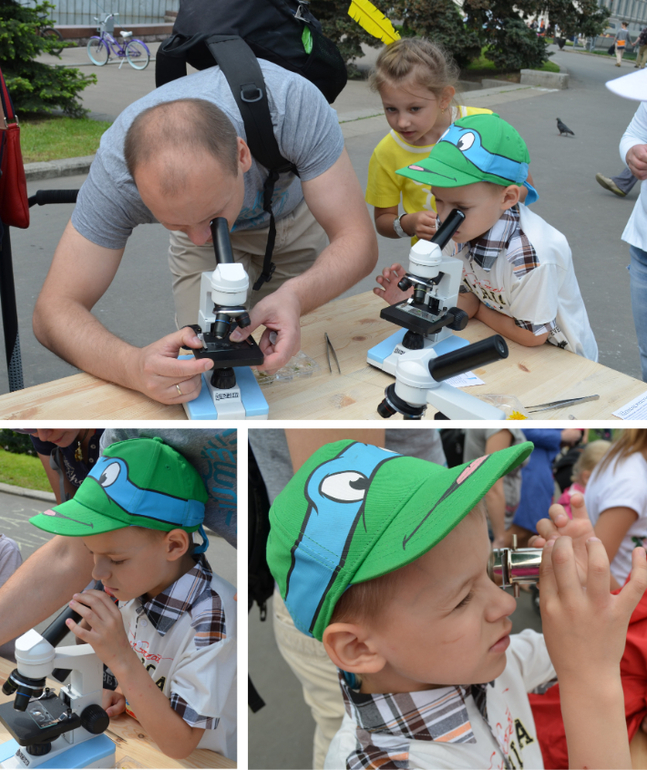 В перерыве между выполнением заданий квеста зависли у микроскопов. Теперь хочу домой такой))) Андрею дали пробирку для проб, охотится на жуков теперь))