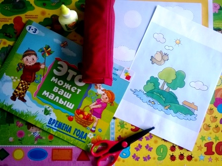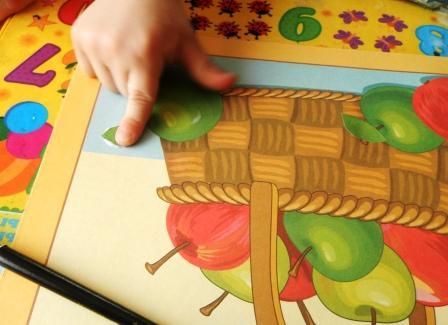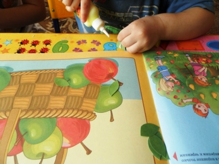 Придя домой мы занялись аппликацией. Наклеивали на яблоки листочки в пособии " Это может ваш малыш", сын очень любит аппликацию, поэтому нам было в удовольствие.