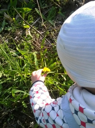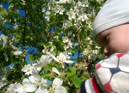 Гуляя на улице мы разглядывали траву, одуванчики рвали, а так же трогали, нюхали цветущие деревья, я рассказала, что из этих цветочков вырастут летом, вишня, груши, смородина, яблоки.