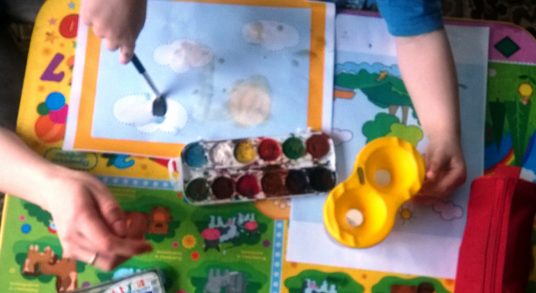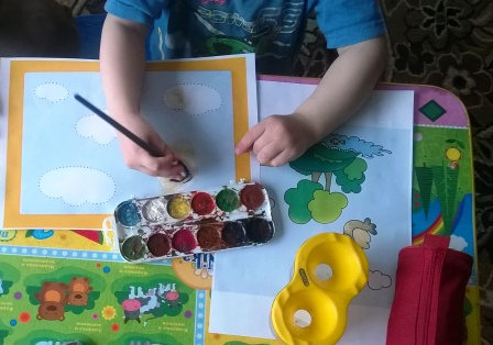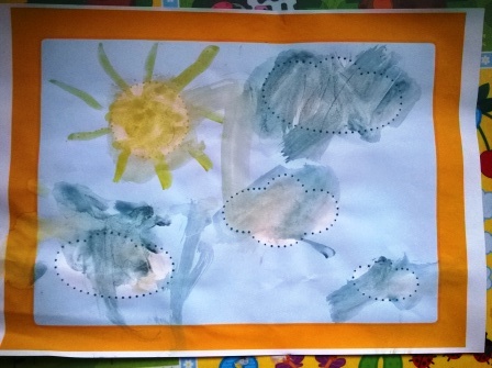 После сна раскрасили для птички небо, тучки и солнышко. Меня радует, что у Глеба начинает получаться раскрашивать определенный предмет, пусть и нарушая границы. Солнышку лучики дорисовала я. Материал брала тут