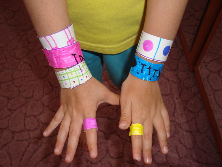 Мистер Умелец или Очумелые ручки (поделки, аппликации, интересные находки, идеи и задумки)Когда Тася в очередной раз надела все имеющиеся детские кольца на свои пальчики и натянула резинки для волос на руки и на ноги, я решила, что пора включать мозг). В голову пришла замечательная мысль- почему бы не сделать украшения из бумаги? И мы взялись за дело.