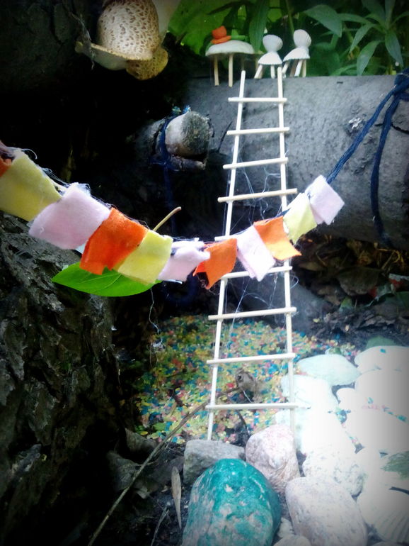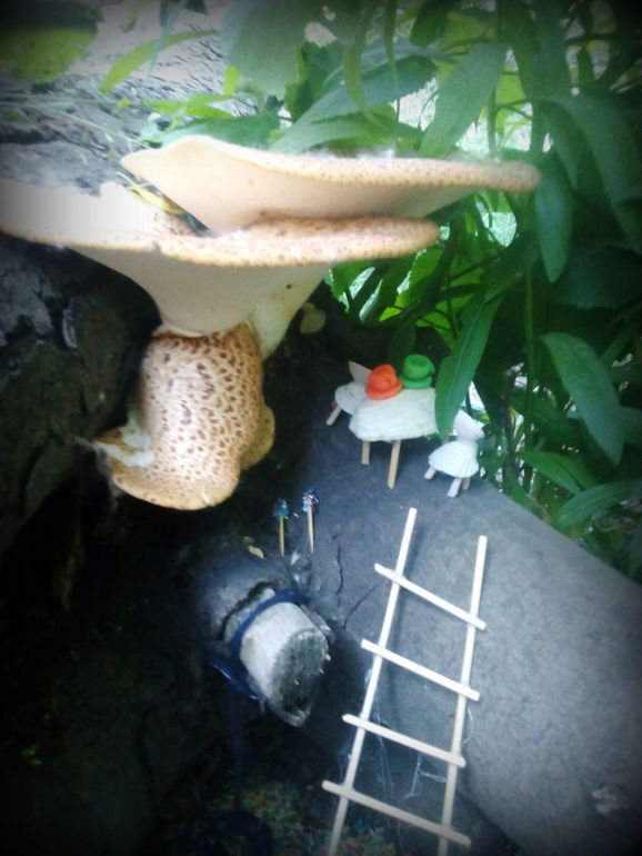 Спасибо большое))) домик вообще спонтанно получился, планировала просто на улице что-то из веток соорудить, но решила из дома камешки и ракушки прихватить, а потом вошла во вкус и появилась лестница, мебель какая-никакая, флажки... А тут ещё и бревно такое замечательное с грибом нашлось.