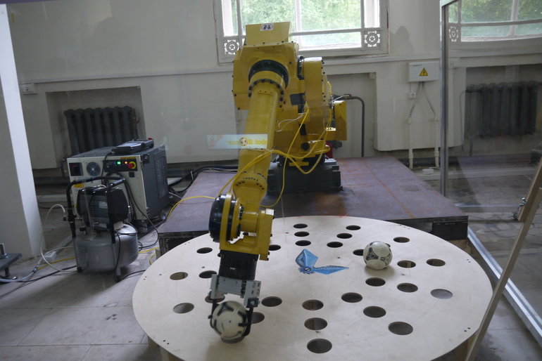 Робот, который переставляет шарики. Обычный робот, используемый на конвеерном производстве.