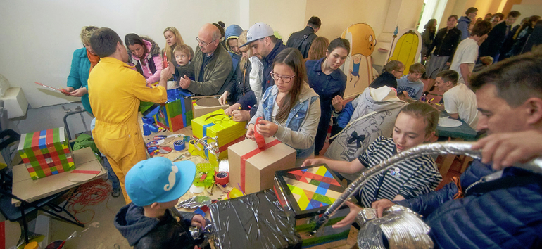 Также предлагают самому изготовить из коробки , цветного скотча и одноразовых стаканчиков голову робота.