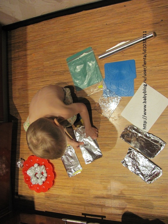 Еще как вариант - верху кладете лист фольги (у нас была обычная "для запекания") и протираете пальчиком. Или раскатываете пластилин на листе и сверху сильно прижимаете трафареты, мы потом "долепляли" этот рисунок разными цветами пластилина. А если есть трафарет белого цвета - можно учится раскрашивать не заходя за линии.