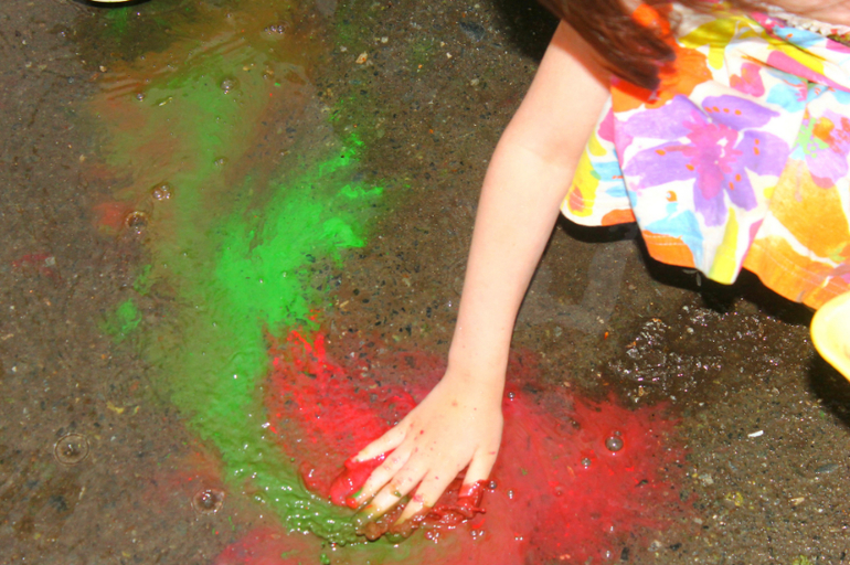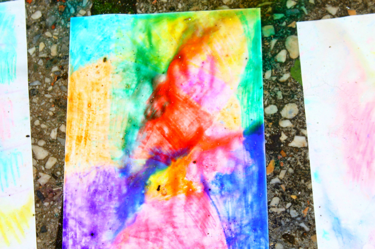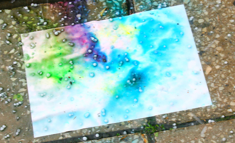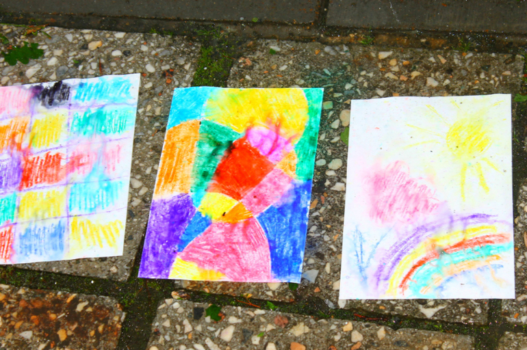 Рисовали с помощью дождя. Оказывается если любые совершенно рисунки (акварель,гуашь, карандаши, фломастеры ) выложить под дождь, капли растворят цвета, создадут "переходы" и вообще красиво получается (не выставляйте только под сильный дождь, там все сотрет и глазом моргнуть не успеете)