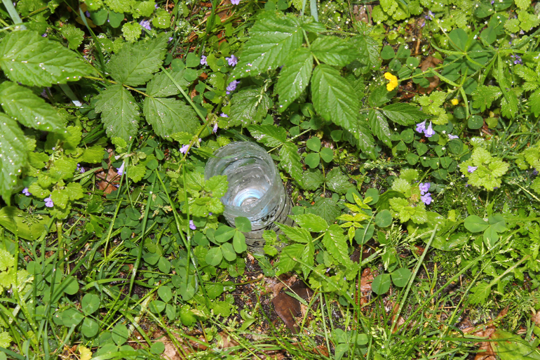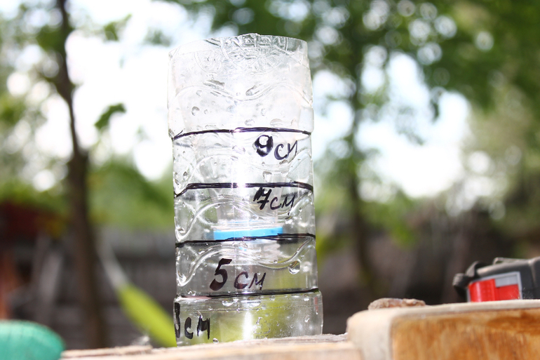 Еще появился у нас измеритель дождя. Это вот такая вот обрезанная бутылка с отметками