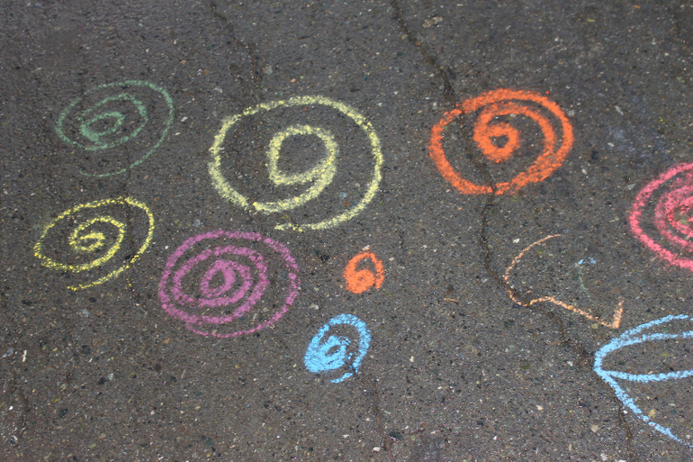 Рисовали мелками на мокром асфальте. Они (мелки) рисуют ярче и рисунок надежнее