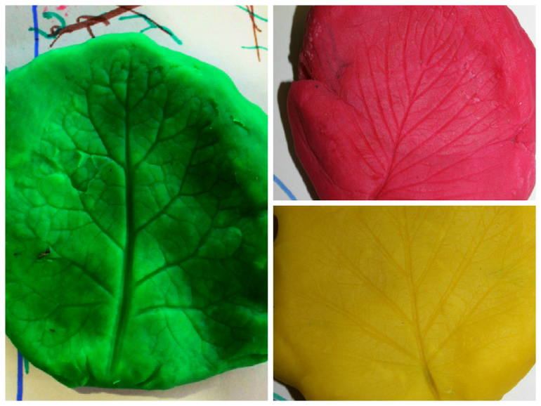 Но чем же мне все же удалось занять детей,когда они находили время на меня в своем плотном расписании. Делали отпечатки листьев в самодельном пластилине и рассматривали получившийся рисунок.