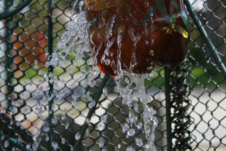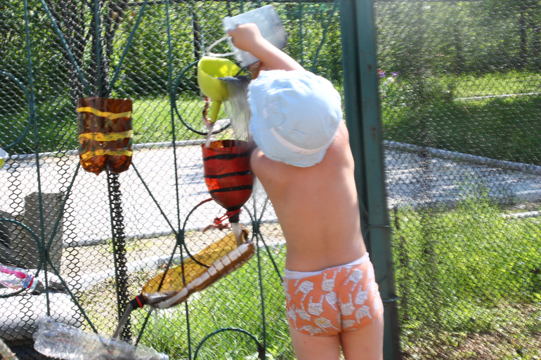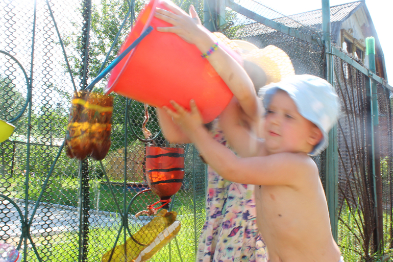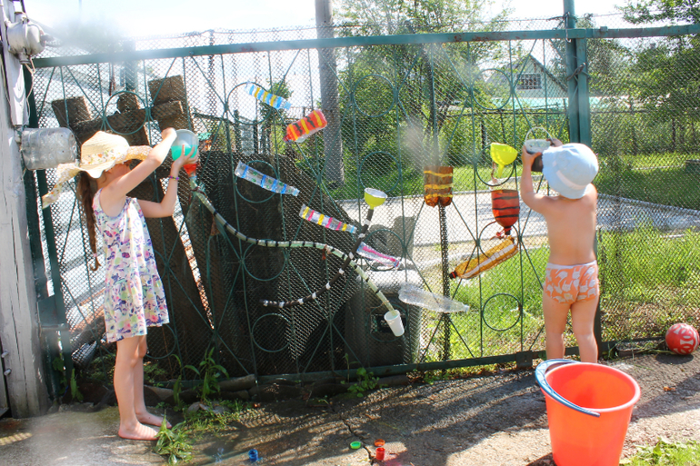 Я была по большей части опять предоставлена сама себе и занималась огородническими делами в большинстве своем, пекла оладьи и бродила с фотоаппаратом по лесу т.к. дети были все в своих друзьях. Были выходные и народу в нашем садовом товариществе прибыло.Но кое-что нам все же удалось сделать вместе.Первый день был жарким, но не таким изнурительным для меня как ранее,но вполне можно было играть с водой. Появилась у нас вот такая водная стена (сейчас она еще разрослась вширь , но фото ток на этом этапе)