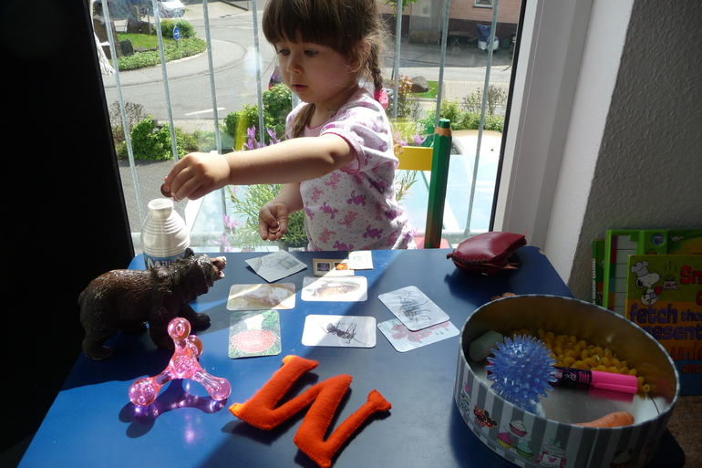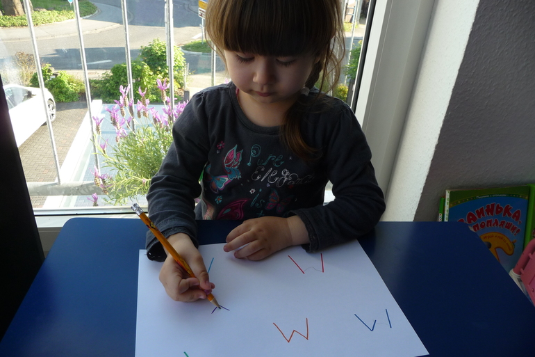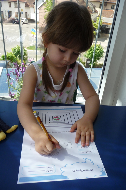 Довели медведя до малинки по лабиринту. А потом обвели все буквы М в словах. После всех букв М, Эвуша казала, что и буквы А она тоже обведёт.