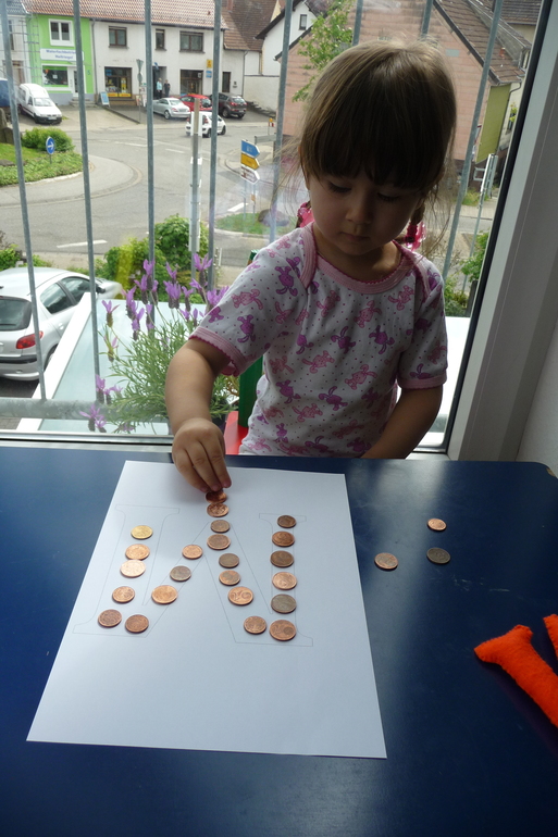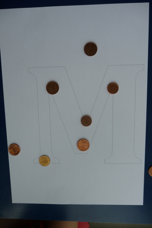 Потом Эвуша по моей задумке должна была выложить букву М монетками. Но Эва не любит стандартных заданий, поэтому, она выложила сначала глазки, носик, потом появился пупочек, и ножки.