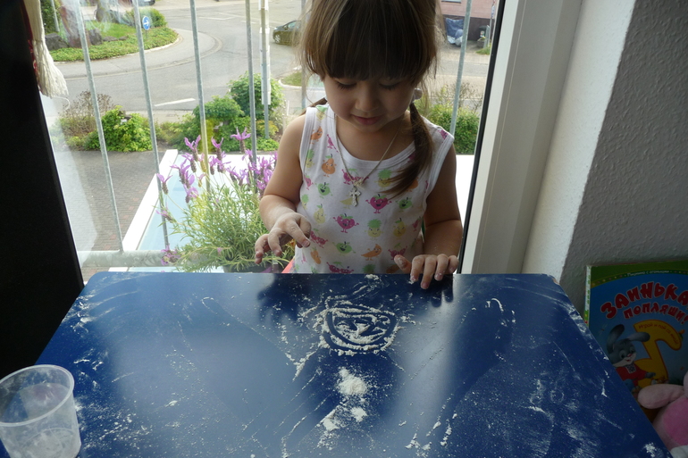 Мама написала букву М клеем, а Эвушка посыпала мукой.