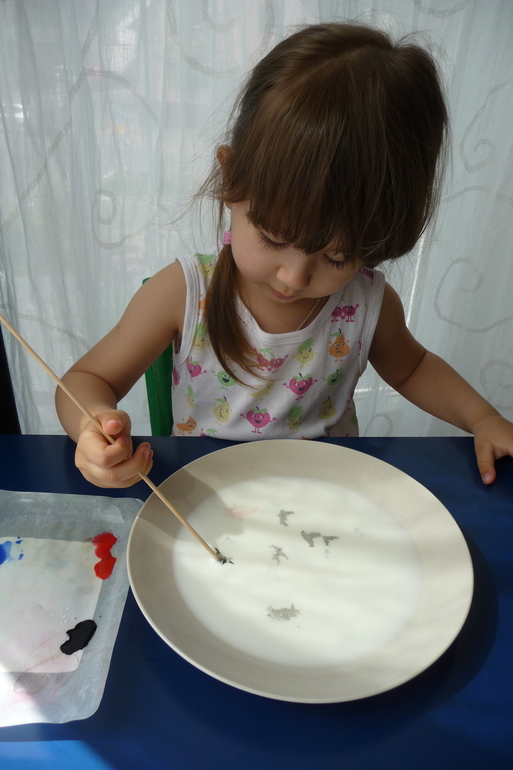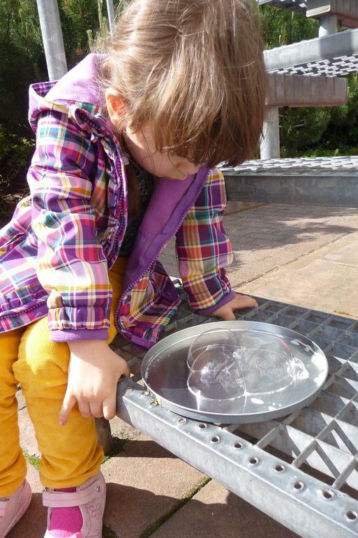 Устраивали мыльные выкрутасы на железной крышке. Эве Очень понравились когда 3 шарика находятся один в одном (от самого маленького к большому). Сама пробовала надувать пузырики.