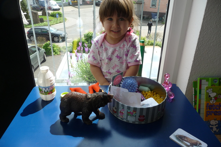 Чего здесь только нет: медведь, молоко, массажный мяч, "массажная молекула" (розовая штучка для массажа, мы её так называем), маркер, макароны, морковь, марки, мелок и кошелёк в виде коровы. Что? Коровы не на букву М? А как она говорит? Муууууу.... А внутри Нашей мычащей коровы - монеты)