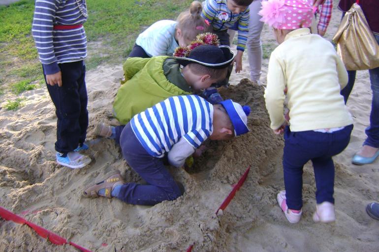 Но у нас во дворе две песочницы, поэтому и играли в игру горячо-холодно. Нашли и стали копать.