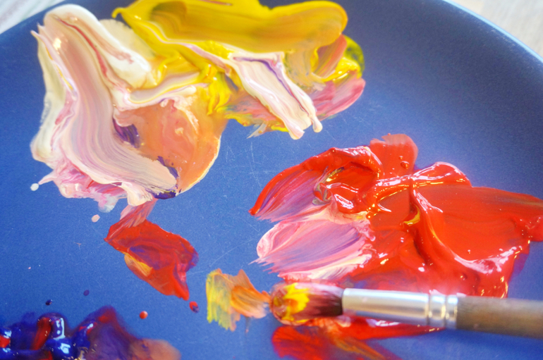 краски и мелки и карандаши валяются по всей комнате в открытом доступе