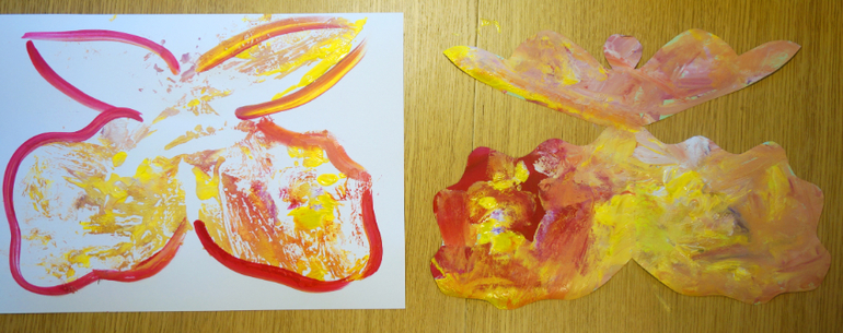 Художка ( красим, рисуем , придумываем новые способы рисовать)Часто в детстве мы делали половинчатые рисунки, а потом штамповали вторую половину. Чаше всего это было на белой бумаге, а мы с Машей брали разноцветные листы и вырезали форму бабочек заранее, капали хаотично гуашь и получали чудесные отпечатки! Комната наполнилась тропическими гигантскими бабочками. В очередной раз поняла, что цветовосприятие дочери гораздо богаче моего!
