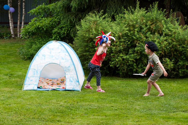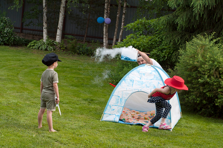 Воспользовались нашим домиком, что стоял к кустах (импровизация, помним?)), кусты же сделав занавесом откуда выходят актеры, придумав НЕВИДИМЫХ героев(!!!), чтобы было побольше участников, показали нам шикарный спектакль на 6 минут.