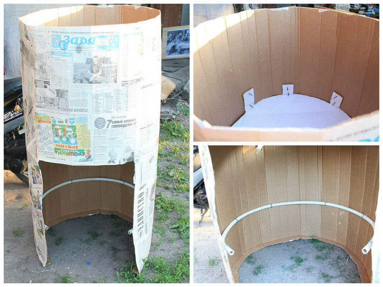 итак, конструкция будет большая потому мы сделали основу - большой картон закрепили на тонкой трубе внизу и картонном круге вверху. Получился цилиндр, дальше несколько слоев газет, клеили не очень мелкие куски, формат А5 и А4.