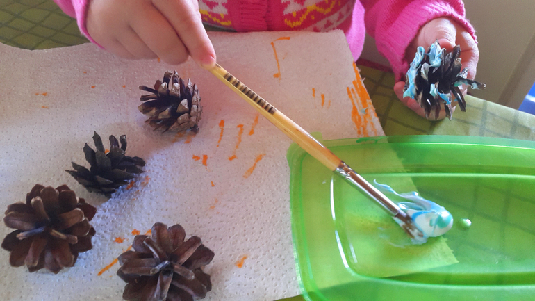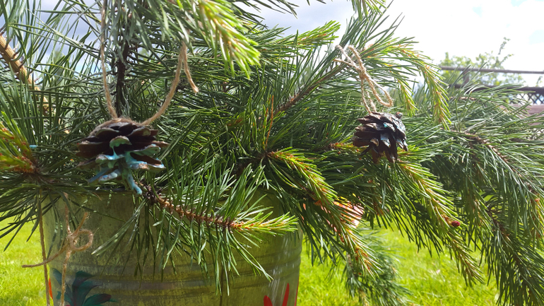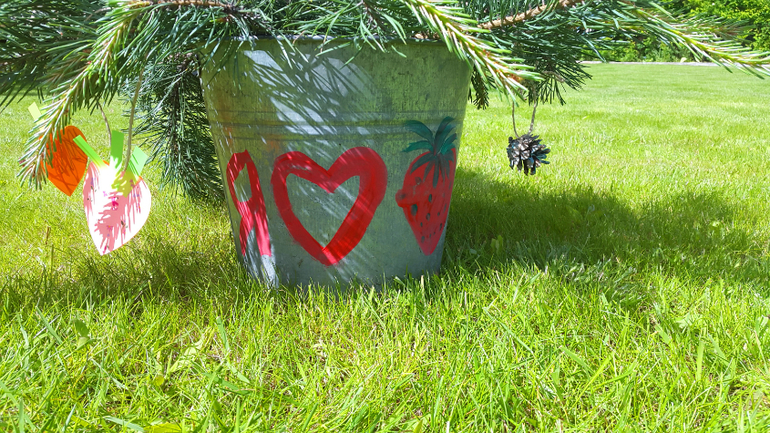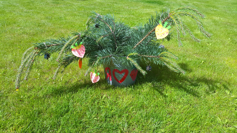 Мистер Умелец или Очумелые ручки (поделки, аппликации, интересные находки, идеи и задумки)Случилось так, что у сосны на даче пришлось обрубить несколько старых веток, но макушки были прекрасны и свежи! Мы быстренько соорудили с Машей еловый букет, установили его в большое ведро и пару дней ходили кругами, принюхивались к ароматом хвои и смолы!Но чего-то не хватало! Мы решили по-летнему оживить наш букет, снабдив его "клубничкой", дабы визуализировать мечту скорейшего созревания этих чудо плодов на наших дачных грядках! Для этого нам понадобились стикеры в форме сердца, немного фломастеров, краски, декора, нитки, скотч...Процесс пошел так яро, что пришлось красить шишки, а краски под рукой не было - отлично помогла зубная паста! А в довесок и ведро раскрасили, вот такое вот теперь творчество у нас на свежем воздухе!