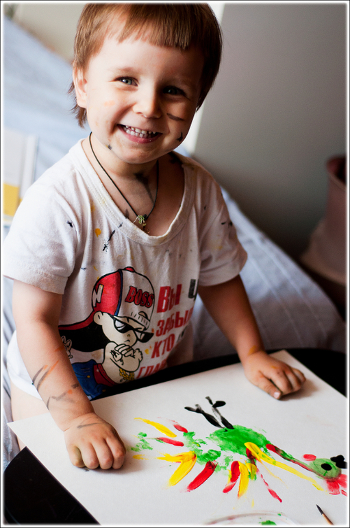 я постоянно спускаю последние деньги на лабиринте и нисколько об этом не жалею)я - книгоманьяк со стажем и любитель всяких творческих занятий с ребенком. Так вот,КЛЯКСЫ Норберта Паутнера - отличное пособие для того ,чтоб повозиться с красками.Мой ребенок больше всего рисовать любит именно красками,но не смотря на то ,что это дело оч увлекательное и здорово развивает ,оно особо хлопотно для мамы,последующая за таким развлечением ребенка уборка ,отмывание краски в квартире повсюду,а так же головомойка самого художника ,резко сокращают желание выдавать краски очень часто),Так вот,если рисовать ручонками по образцам из этой книжки ,на память останутся суперские шедевры,Репин ,Васнецов и иже с ними нервно курят),а потому убирать последствия уже не так влом ,а до кучи еще и приобретается клевое настроение -- ОО мой отпрыск гений наваял не только каля- маля ,а прям картинку!))))Так вот ,покажу ,как мы попробовали сегодня изобразить петуха) СКазать ,что остались довольны - ничего не сказать ,восторг!!!!)