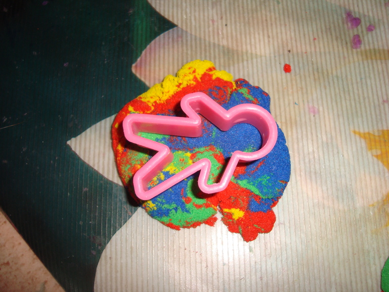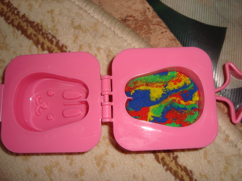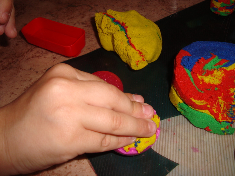 Он не будет сыпаться как обычный песок, он довольно плотный и вряд ли подойдет для совсем малышей. Зато он идеально хорош для лепки из формочек. Для этого нужно небольшими порциями РУКАМИ вдавливать его в формочку, можно сочетать цвета и в результате получаются замечательные и крепкие фигурки. Выскакивает от из формочки легко. Мы применяли для этих целей всякую всячину- половинки из-под киндеров, формочки для варки яиц, формочки для теста.