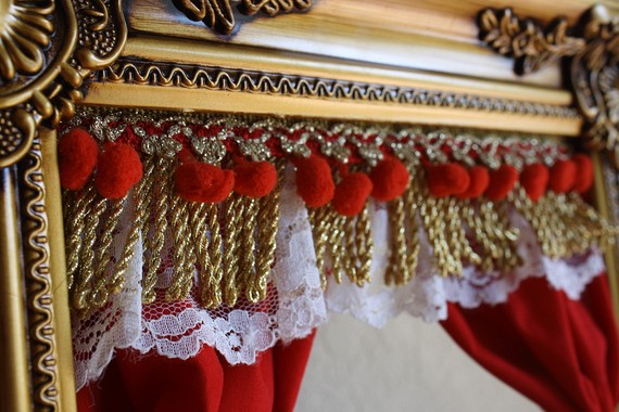 Убрав стекло и оставив только саму раму, мы украшаем наш театр, можно еще и масочки понаклеить занавесом.