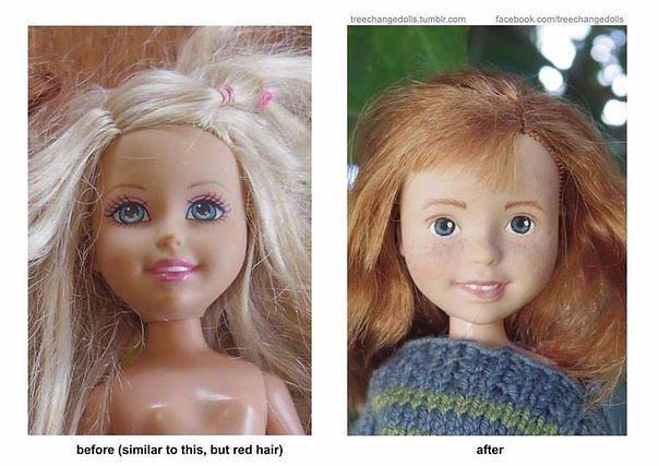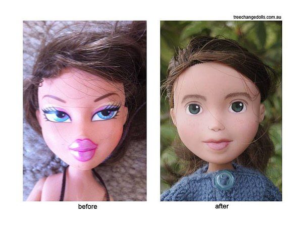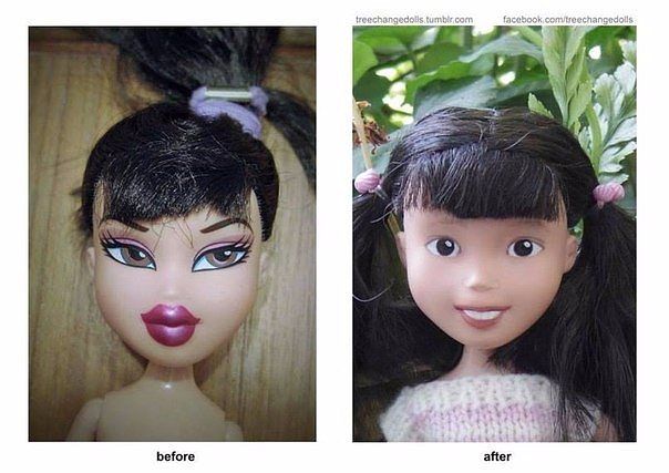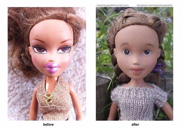 Разное (если затрудняетесь с выбором)Одна австралийская мама, насмотревшись на современных кукол, заполонивших полки магазинов, решилась на их переделку. Она покупает Барби и Братц (при этом предпочитает "спасать" их из магазинов товаров бывших в употреблении), стирает их вызывающий макияж, а затем рисует им новые лица и создает нормальную одежду. Куклы, которые изначально были больше похожи на проституток, начинают после переделки новую жизнь, выглядят скромно и естественно, носят одежду, которую обычные люди носят в обычной жизни - вязаные свитерочки, льняные юбочки, платьица и штанишки. Дети с удовольствием играют с переделанными Братц, а родители не перестают благодарить австралийскую художницу за возможность подарить детям реалистичную куклу, с которой приятно играть.