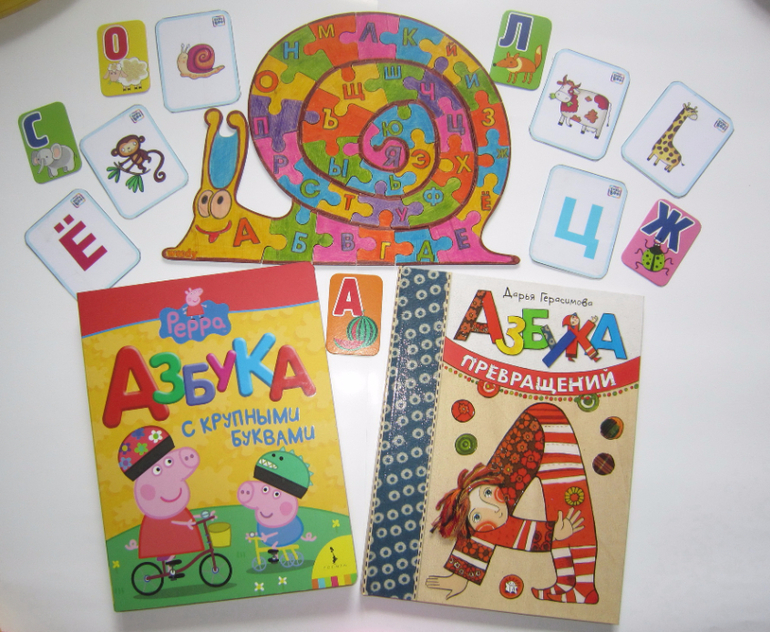 Разные тоненькие книжки с алфавитом у нас были давно (примерно с годика), мы просто читали из них стихотворения, рассматривали картинки, не заостряя внимание именно на буквах. Потом появилось несколько комплектов карточек, но интересовали тоже больше картинки, а буквы мама называла сама себе.
