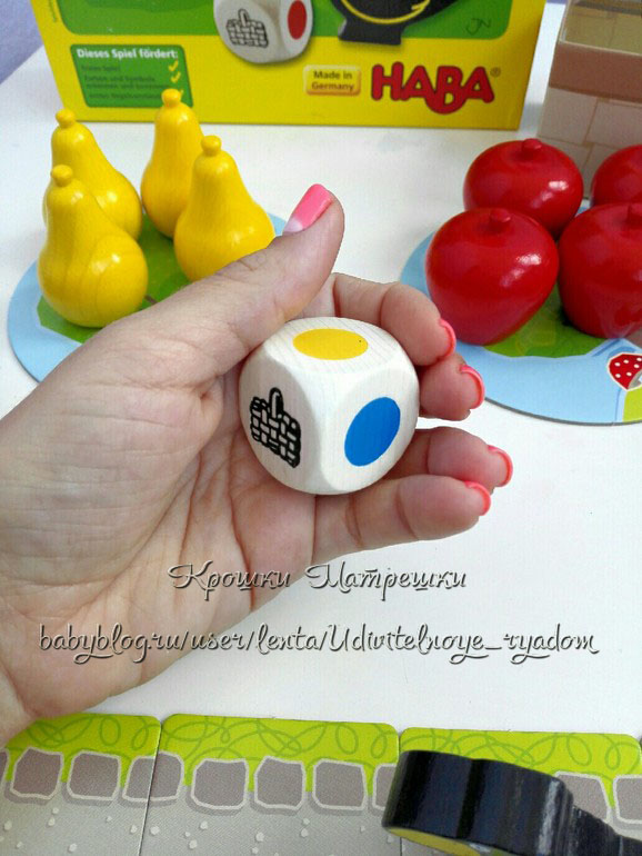 Игра просто супер! В комплекте 4 карты дерева, дорожка, кубик, корзинка, ворона и 16 разноцветных фруктов, 4 сливы, 4 груши, 4 красных яблока и 4 зеленых. Цель игры собрать урожай быстрее, чем ворона доберется до него и склюет.