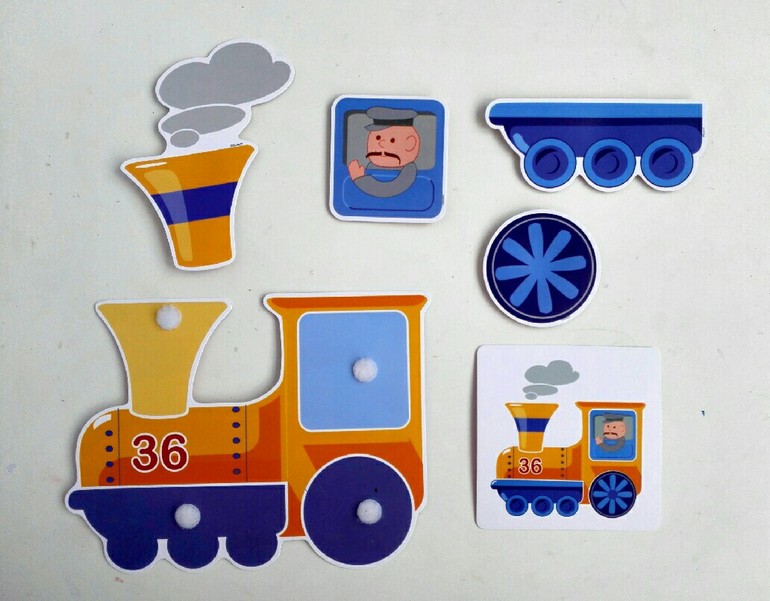 В комплекте 5 карточек с образцом, 22 детали, 6 игровых полей: легковой автомобиль, мотоцикл, трактор с прицепом, бетономешалка и паровоз.