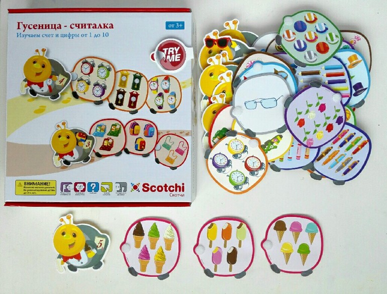 Моя старшая доченьке не любит эту игру, играем редко. Считать умеет, но видимо лениться или скучно, не пойму. А еще дочка очень хитрит, у каждой гусеницы с цифрой есть предмет, который соответствует тем, что надо присоединить. Например у гусеницы с цифрой 5 есть мороженное в руке и к ней надо присоединить карточки с 5ю предметами, это рожки, эскимо, в общем мороженое и вот дочь не считая, просто логически сопоставляет картинки, видимо лиж бы я отстала))).