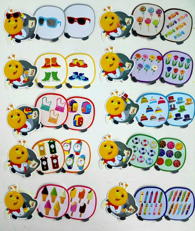 В комплекте 10 карточек-гусениц с цифрами от 1 до 10, 30 карточек с изображением предметов в различном количестве.