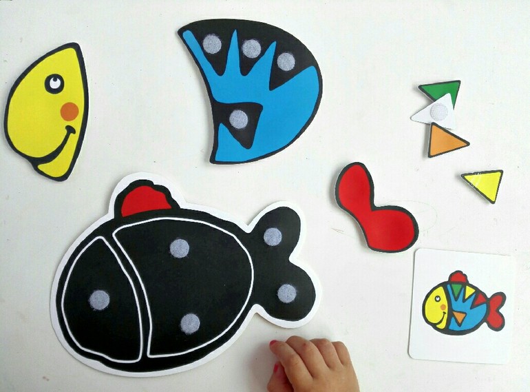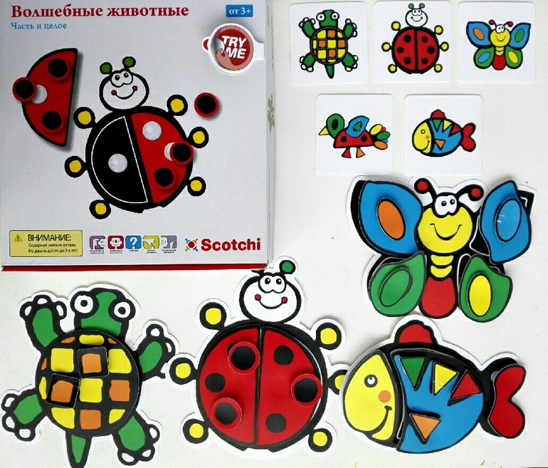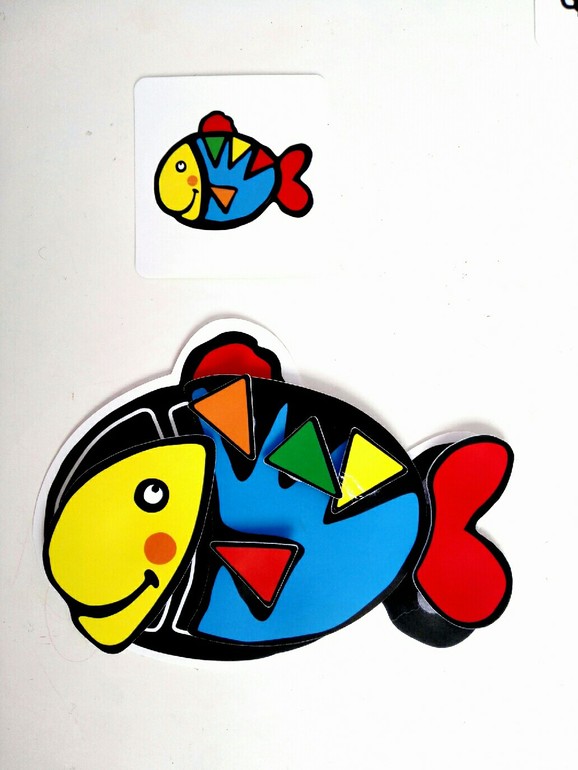 На коробке указан рекомендованный возраст 3+, но играть можно с полутора точно, моя дочка(1,7) справляется очень даже прилично! Может аккуратности не хватает и внимательностьи, но справляется. Это нам кажется, что все просто, а маленькому ребенку надо догадаться, что сначала надо положить само тело и на него точки, пример божьей коровки! это еще и обучение пространственному мышлению. Пока дочка складывает, я проговариваю детали, голова,туловище, хвост, акцентируя внимание на то, что плавник похож на треугольник. Это дочка в процессе и ее готовая работа.