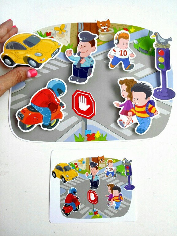 По ходу игры мы проговариваем название транспортного средства, его части, колеса, двери, выхлопная труба и т.д., и водителей, например паровозом управляет машинист, мотоциклом мотоциклист и т.д. Расширение словарного запаса!