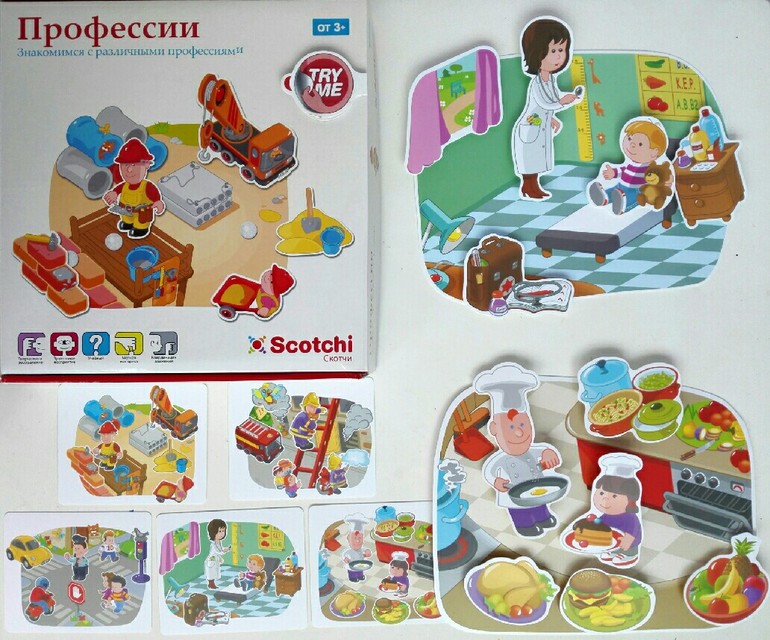 С младшей мы пока не играем, а со старшей дочкой начинали в 2, но интереса не проявляла, а вот в 2,5 играли с удовольствием! Правда тогда профессии она уже знала, но играть от этого было еще интереснее, без карточек заданий нужно правильно разложить все предметы по принадлежности к профессии, поверьте задание не из простых! Игра способствует расширению словарного запаса и интересу к познавательной деятельности!