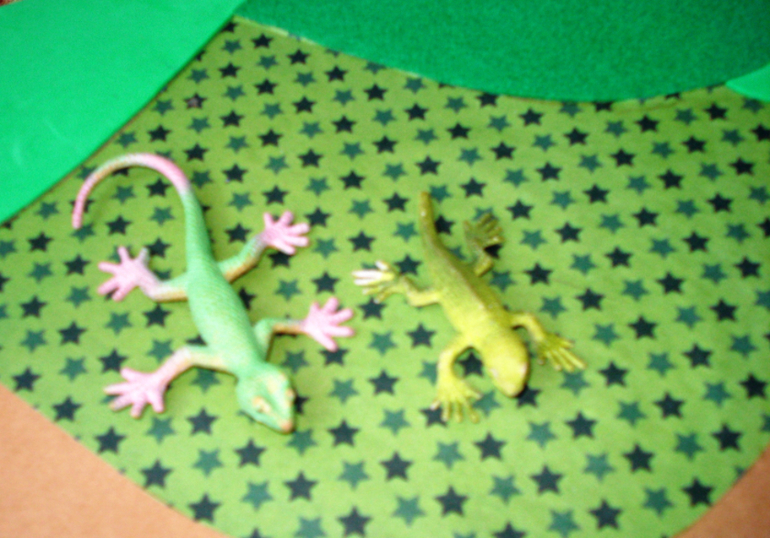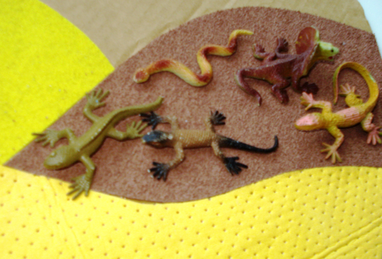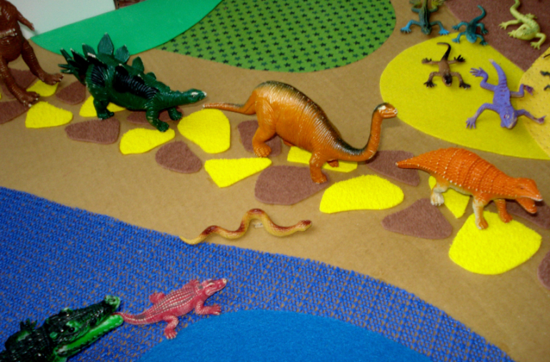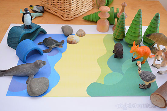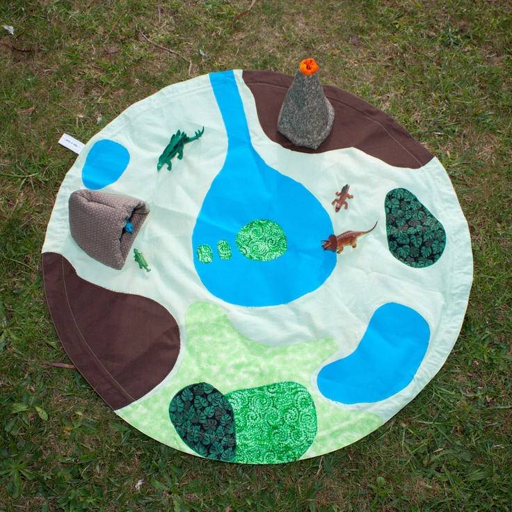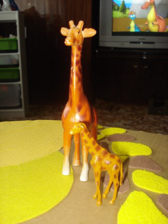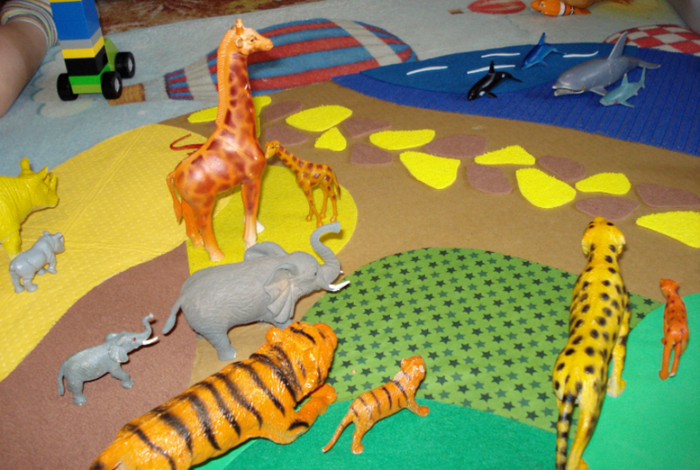 Коврик сделан из куска коробочного картона (размер примерно 80 см х 50 см). Вырезала основание округлой формы, приклеила разнофактурные материалы, имитируя среды обитания животных (это, конечно, очень условные зоны - леса, водоемы, пустыни)… Хранится за шкафом, достается при необходимости…