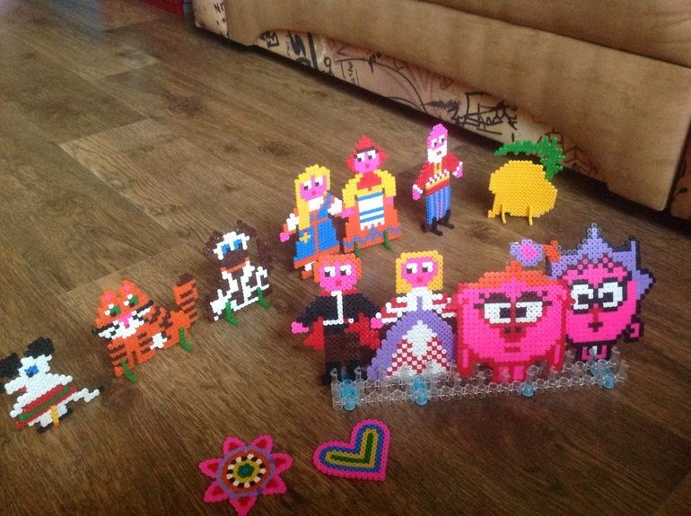Принц и принцесска, пара смешариков ( у Нюши хвостик на голове отвалился, нужно опять прогреть), ну и цветочек-сердечко.