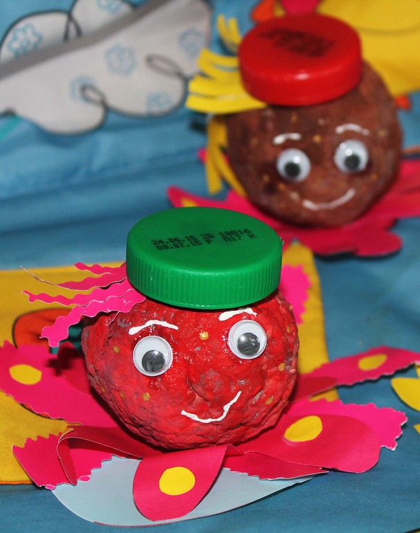 Мы замесили бумажное тесто просто из нее. Потом слепили шарики, с усилием выдавливая воду. Когда шарики высохли покрасили их краской. Из цветной бумаги вырезали ноги, украсили как смогли. Шапки приклеили на пластилин.