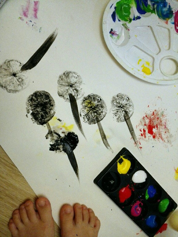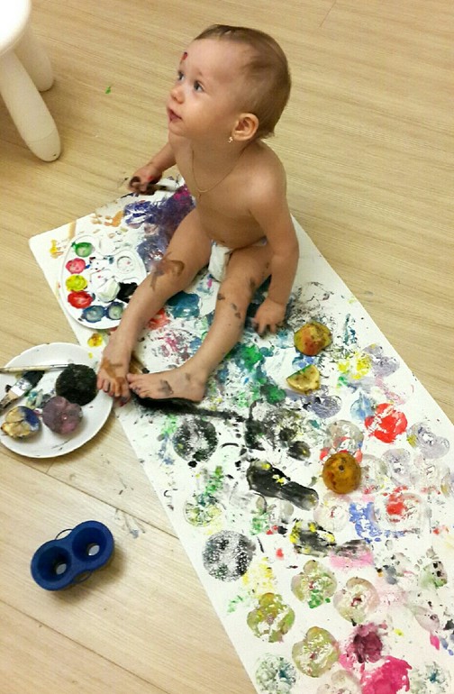 Конечно Сонечка с начала пальцами повазюкает, потом берет фрукты и ими шлепает как штампиками, потом в ход идут кисти и губки, потом руки и ноги))) У старшей сначала отпечатки потом трафареты а потом тоже ноги и руки)))) А потом баловство красить друг друга)