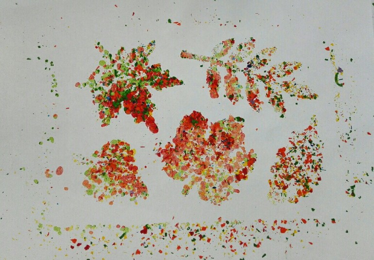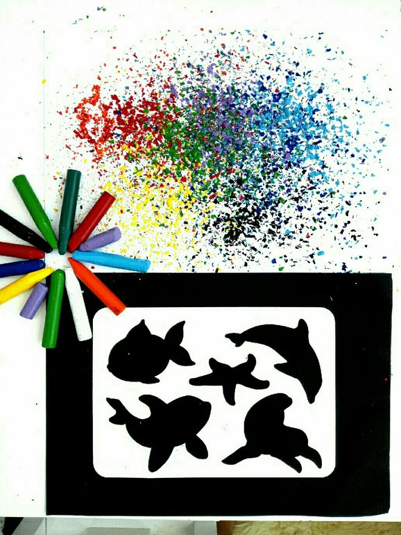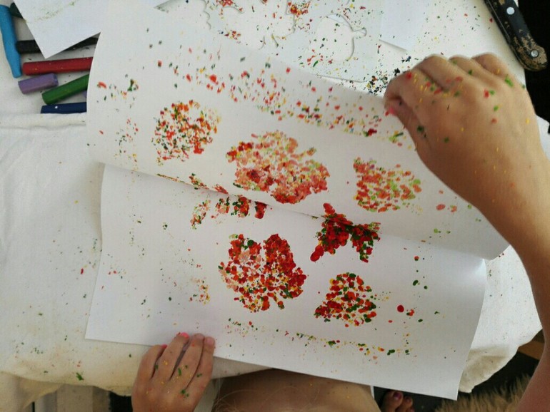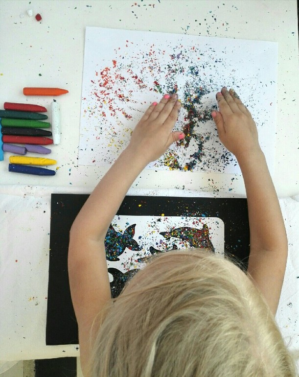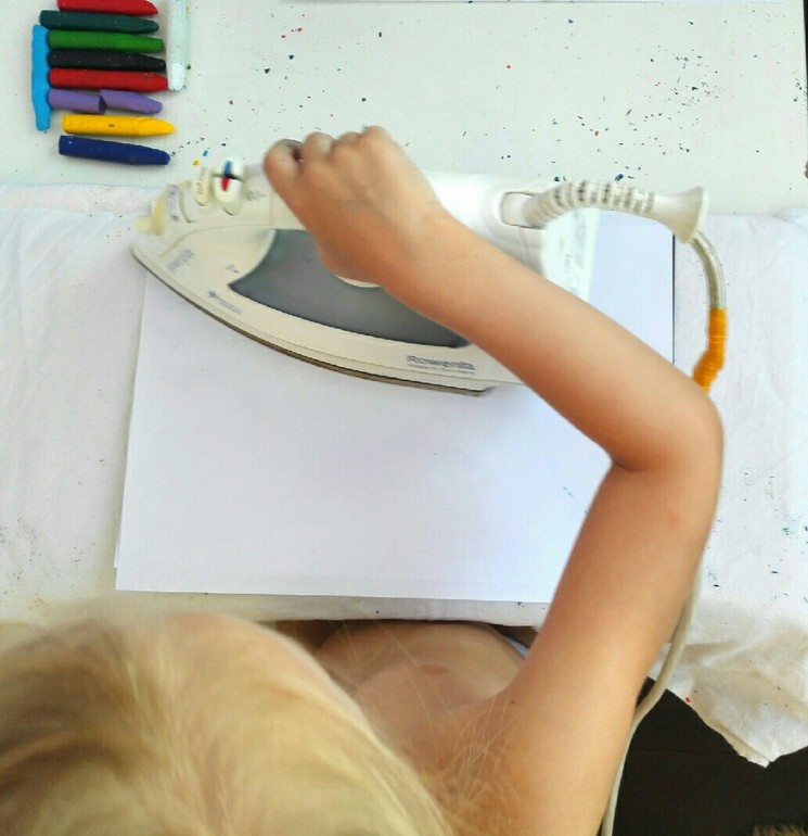 Мы таким способом делаем картины, к примеру через трафареты, дочка сыпет стружку определенных цветов или все в перемешку, как ей самой нравится, убираем трафарет, накрываем другим листом. так же проглаживаем и красота!