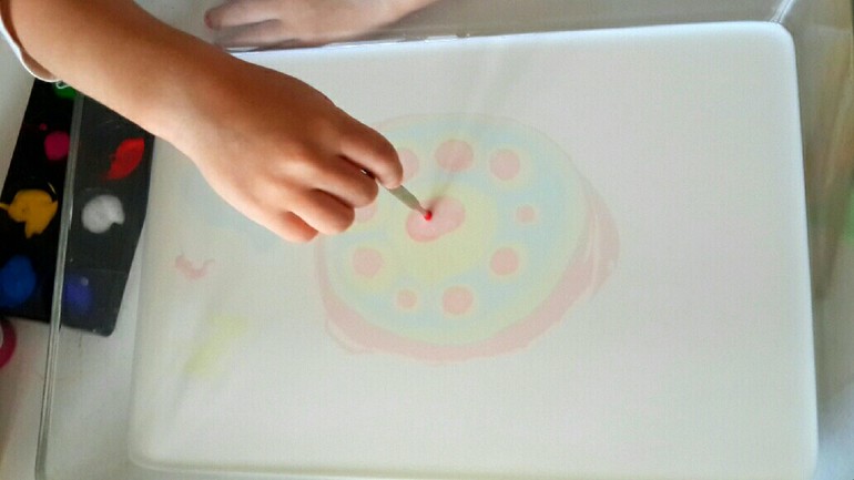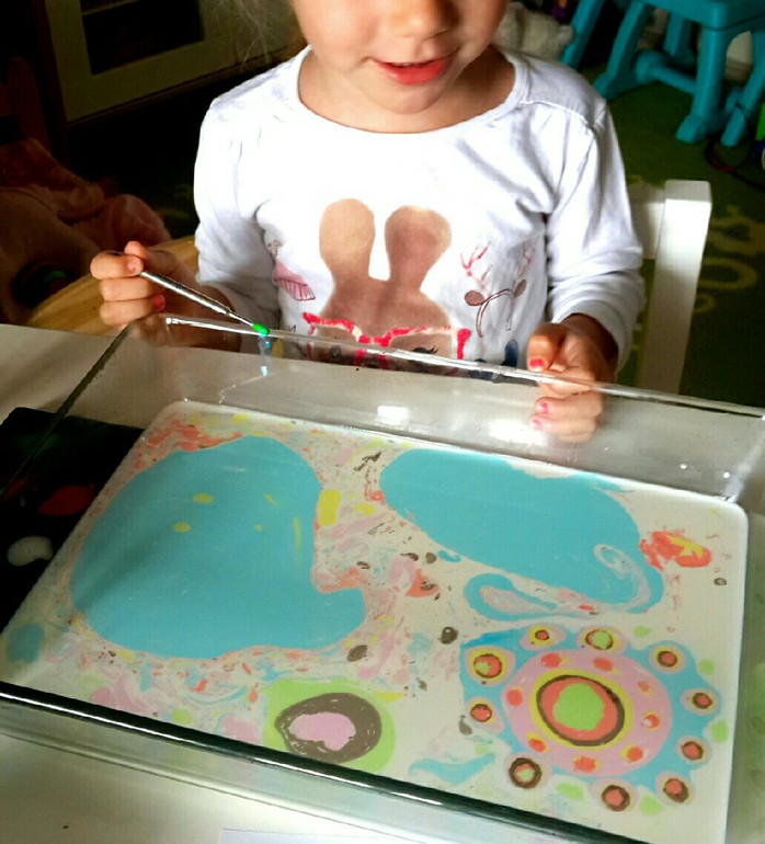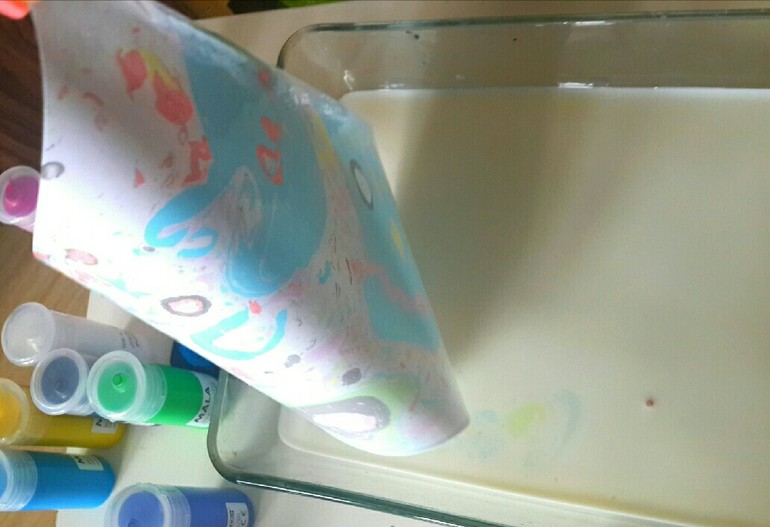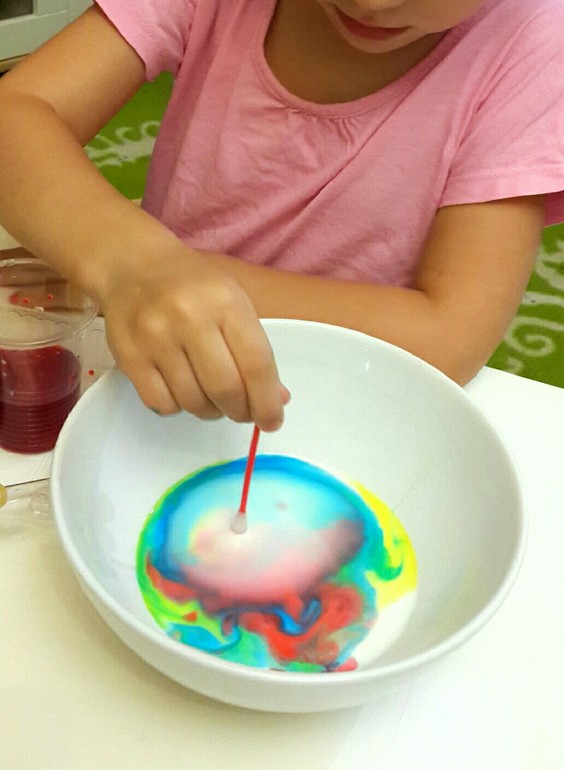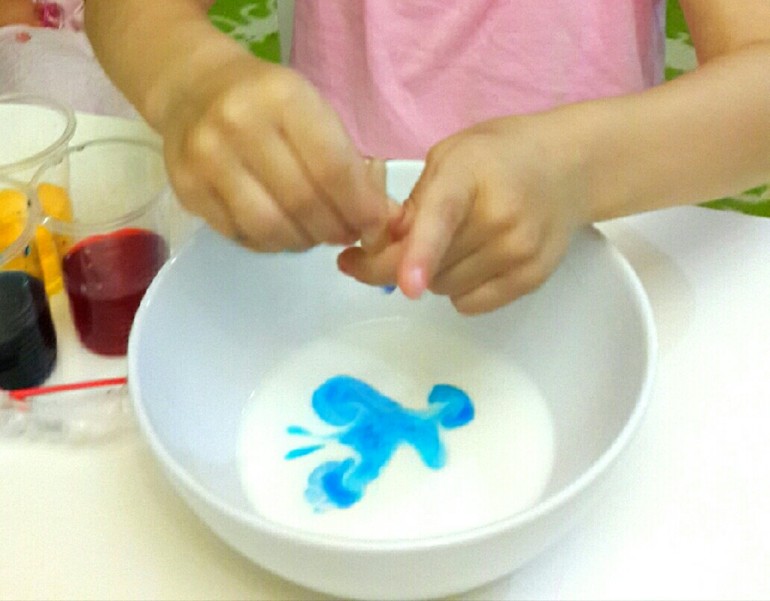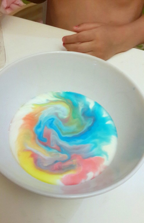 Есть еще способ. Понадобятся пищевые красители, у нас три цвета, желтый красный и синий, из них можно получить любой желаемый, пипетка, ватная палочка смоченная в средстве для мытья посуды и молоко. Наливаем молоко, доченька капает из пипетки красители (очень хорошо для моторики), когда считает что достаточно берет ватную палочку, окунает и молоко оживает! очень интересно наблюдать!