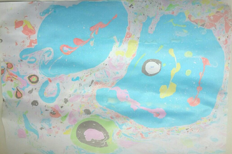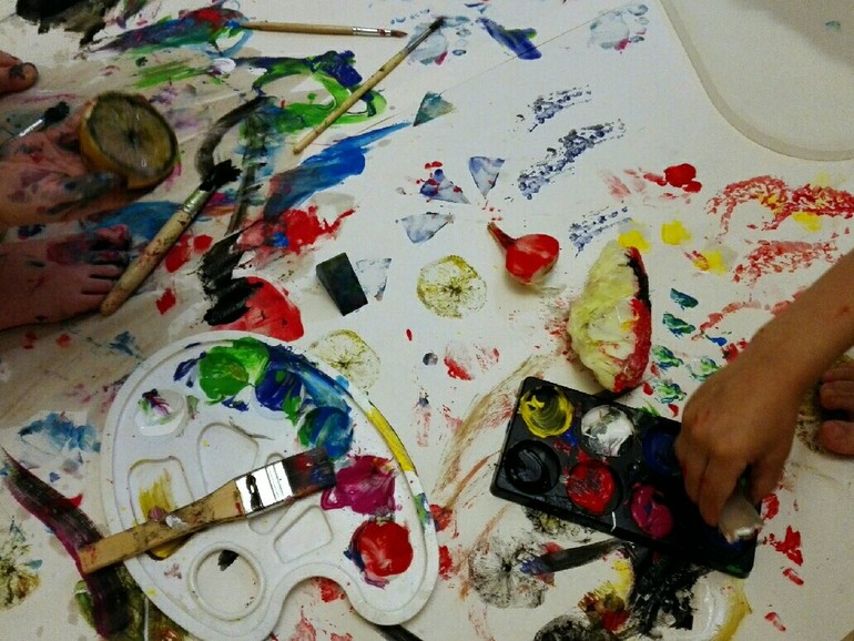 Чаще всего я просто на пол раскатываю рулон бумаги, если на двоих то 2-3 куска,скрепляю их скотчем и к полу так же приклеиваю скотчем, чтобы бумага не скользила по полу и не съезжала. Выдаю им все кисти какие есть в доме, все трафареты, все губки и спонжи, разрезанные фрукты или овощи, наливаю краски в палитры и дальше полная свобода)))).