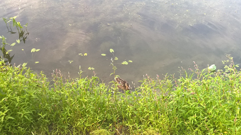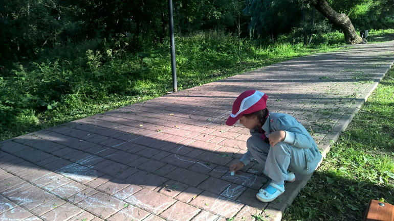 Алине очень понравилось играть, спрашивала про разные цветы, травы. Кроме этого покормили уток, посоревновались кто дальше камушки побросает, у кого быстрее палочка поплывет в речке, порисовали мелками.