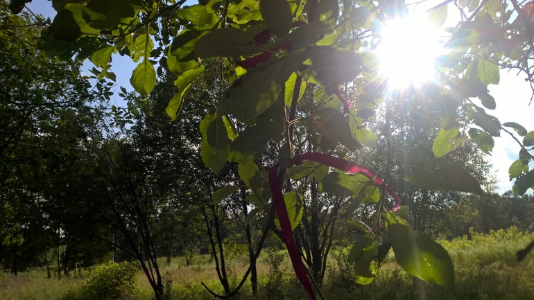 А еще на березах завязывали ленточки и загадывали желания. У меня как раз есть ленточки, можем и мы загадать желание, - сказала я - осталось только березу найти.
