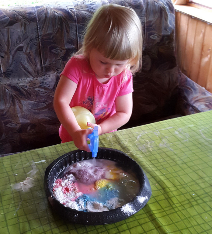 Игры и игрушки от 0 до 99 (Про игры и игрушки которые подойдут и большим и маленьким)Многие мамы работают с содой и лимонной кислотой или с уксусом. Маша часто удивляется этой реакции, когда мы печем вместе пироги. Однажды я позволила ей восхищаться целым вулканом, а на днях предложила еще один вариант волшебства! Толстые мелки она терла на терке, да так старательно, потом мы добавляли соду, а самое увлекательное, что уксус я налила в распылитель, чтобы эффект пузырьков был дольше. Операцию мы эту повторяли раза 4, полностью помыв посуду. Радости не было предела. Играли час утром и час вечером, а на вопрос, что понравилось тебе больше всего? Дочь ответила, что терка!!! Кто бы мог подумать, что доверив ей тереть (хоть и не без опасений), я буквально исполнила ее мечту поделать это ""взрослое" дело самой! Ну, а пузырьки ее все равно тронули до глубины души!