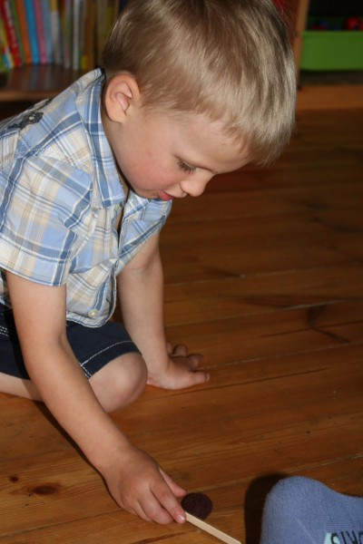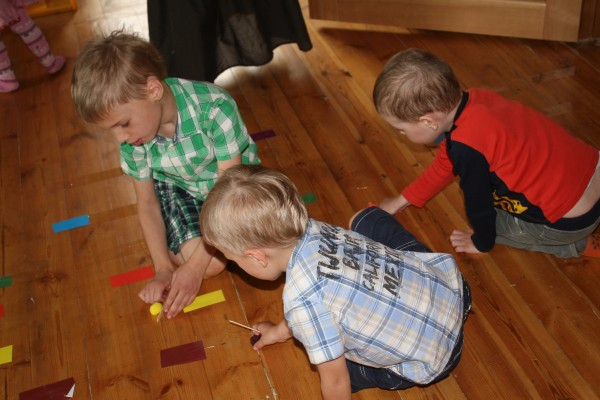 Для начала нужно было найти к ней дорогу. Дорогу показывал волшебный шарик . Шарик у каждого катился по цветной дорожке, на островках цветных надо было кричать шнирру-шнарру :) Катить шарик помогали волшебные палочки)) чтоб не толкались, я детей не всех вместе сразу запустила, а с паузой небольшой ))