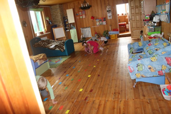 Потом мы попали на болото. И чтобы хмыри нас в болоте не покусали, нужно было слушать команды :) Если я сказала зеленый и показала розовый, то прыгаем в зеленый квадрат.