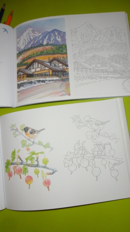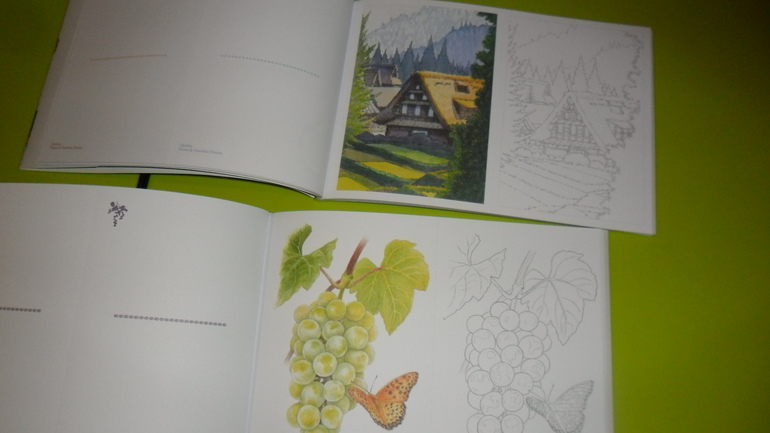 Альбомчики не большого размера. В каждом по 16 рисунков. В одном натюрморты, в другом - пейзажи. Каждая страничка поделена на две части. Слева - рисунок, справа - только контур этого рисунка, который нужно раскрасить, глядя на оригинал.